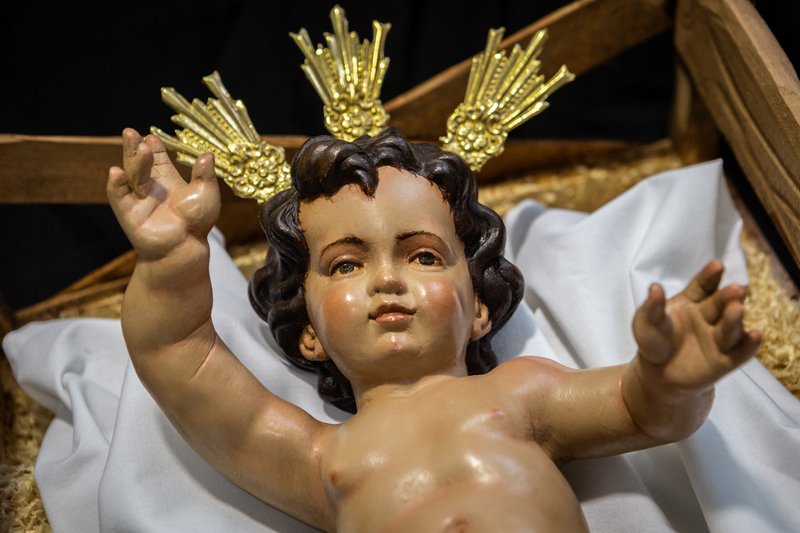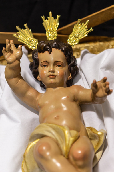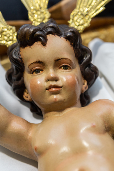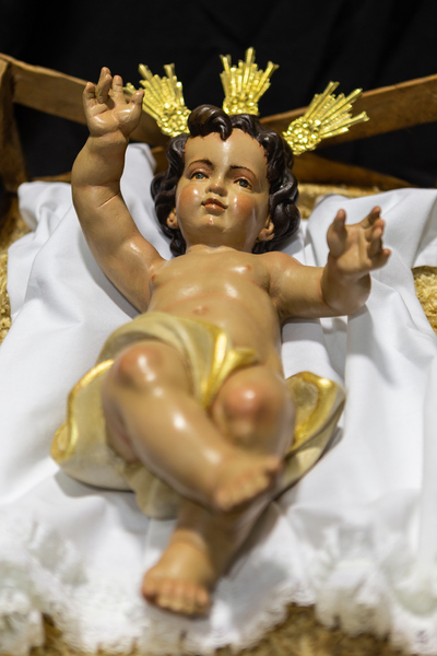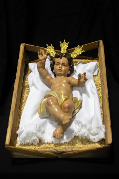 Escultura de Niño Jesús en pesebre. Madera de Tilo policromada al óleo. Iglesia de San Paul, Los Ángeles (California) 2025.